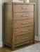This chest sits comfortably at the intersection of modern lodge and farmhouse aesthetics. Your warm and welcoming disposition is reflected in the charming architectural elements and light brown glazed finish. Even with its poise, the chest remains practical. Smooth-gliding drawers tuck away necessities, defining your bedroom with reliable function and style.
