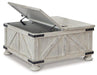 Double up on form and function with this square coffee table with storage. Its dual-lid tabletop provides easy access to the roomy storage space. Crafted with a distressed whitewash finish, crossbuck detailing and metal bracket appliques, this generously scaled coffee table is rustic farmhouse living at its best.